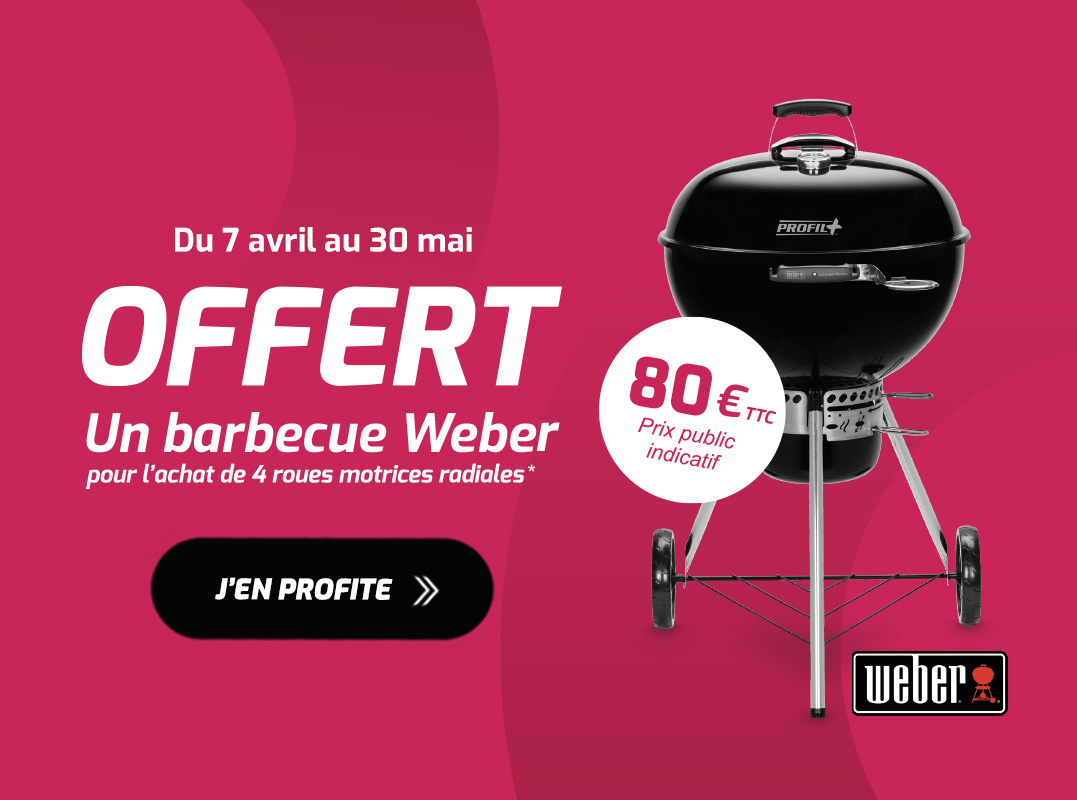 *Entre le 7 avril et le 30 mai 2026 achetez quatre roues motrices de la gamme agricole pour un montant minimum de 2000€ HT dans les marques MICHELIN, FIRESTONE, BRIDGESTONE, MITAS, TRELLEBORG, NOKIAN, VREDESTEIN, CULTOR, BKT, MAXAM, CEAT, ALLIANCE dans un garage Profil Plus participant ou commandez-les sur https://entreprise.profilplus.fr/univers/agricole et payez-les en magasin. Vous bénéficierez d’un barbecue Weber d’une valeur de 80€ TTC (prix public indicatif). Pour bénéficier de l’offre, les pneumatiques devront avoir été achetés en une fois et doivent figurer sur la même facture acquittée. Votre commercial vous remettra votre cadeau en juin 2026. Voir conditions en agence et sur profilplus.fr